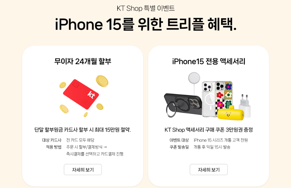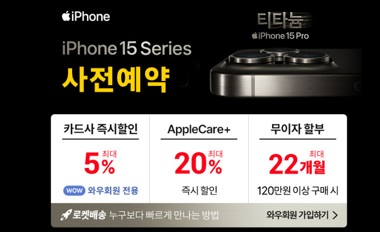 쿠팡에서 아이폰 15 사전예약을 시작했습니다. 와우회원이신 경우는 카드사 즉시할인도 적용받으시고, 120만원 이상이신 경우는 22개월 무이자 할부로 적용해서 구매도 가능하니 확인해보세요 예약하시면서 악세사리까지 함께 보실 수 있다는 점이 아주 장점이죠