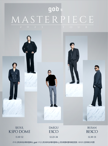 그룹 god(지오디)가 올 연말을 '2023 지오디 투어(god tour)' 콘서트로 달군다. 2일 자정 god 공식 SNS 채널을 통해 '2023 지오디 투어' 콘서트 메인 포스터가 오픈됐다. 포스터 속 god 멤버들은 무채색 계열